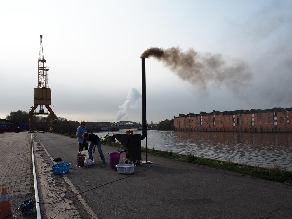 „Getrennt sammeln, gemeinsam verbrennen“ lautete auf einer Fachtagung der Hamburger Abfallressourcenwirtschaft im Februar 2016 ein ganzer Themenblock. Der Slogan zeigt deutlich die Aktualität der Frage, die seit Einführung des Dualen Systems die sammelnden Bürger bewegt: “Werden die von mir getrennt gesammelten Wertstoffe tatsächlich recycelt?“ In Hamburg landet ein großer Teil der Siedlungsabfälle in der Müllverbrennung, darunter auch Verpackungsmüll mit dem grünen Punkt. Vor diesem Hintergrund ließ Nana Petzet eine lokale Müllverbrennungsanlage nach dem Vorbild der in Kenia entwickelten Community Cookers bauen: gemeinschaftlich genutzte Herde, die mit Kunststoffabfällen betrieben werden. Der von 9minus8 *art support und Jochen Weber konzipierte und realisierte Brennofen wurde im Oktober 2017 auf einem Gelände der Veddel erstmals getestet. Kerstin Kuchta von der TU Hamburg nahm bei der Testverbrennung Abgasproben.