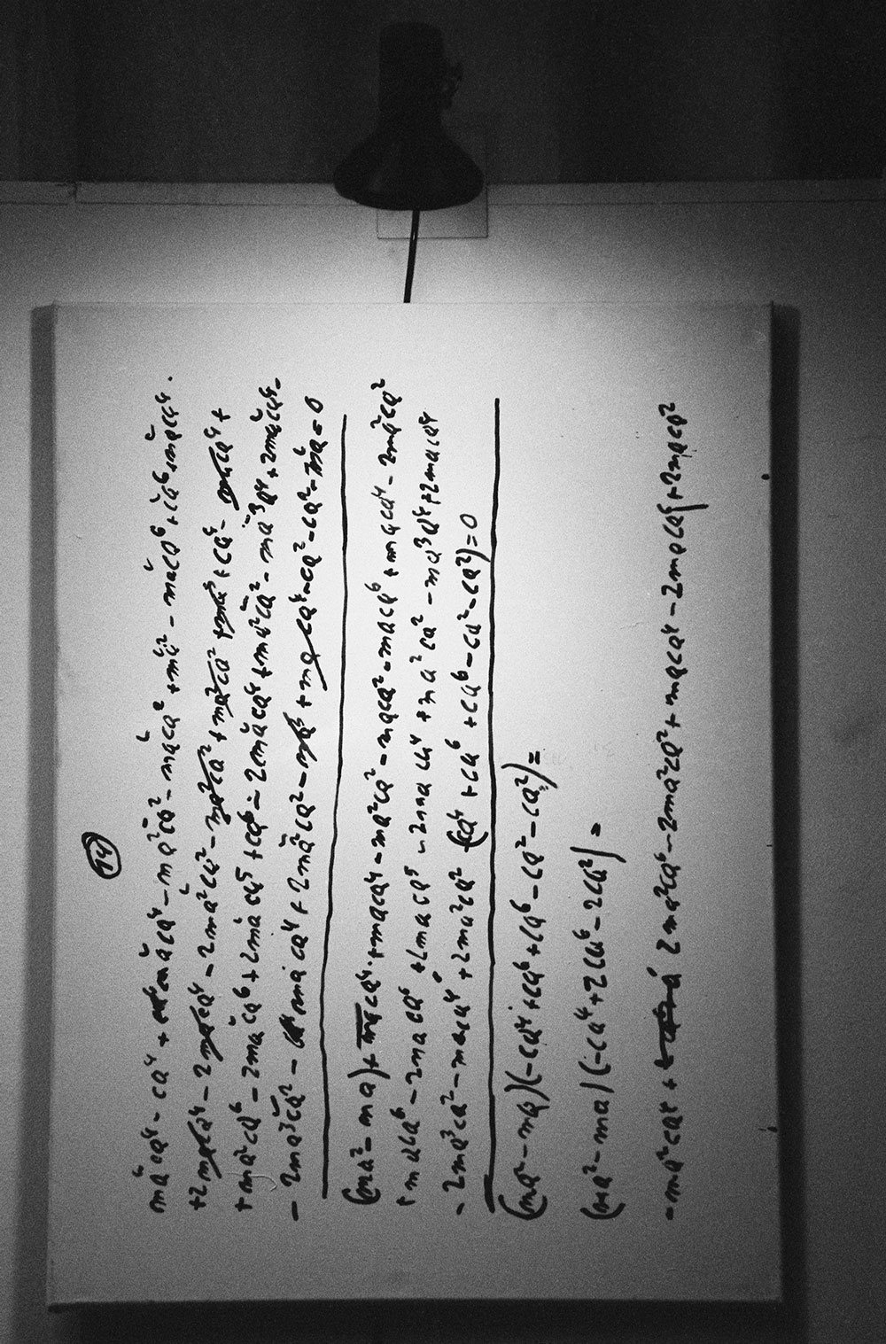 1 Nana Petzet hält einen Vortrag über Gravitationstheorie, Zwischenfragen aus dem Publikum, Diaprojektion; 14 Gemälde: Dispersion auf Nessel, 90 x 65 cm; 14 Lampen, Akademie der Bildenden Künste, München, 4. Februar 1987